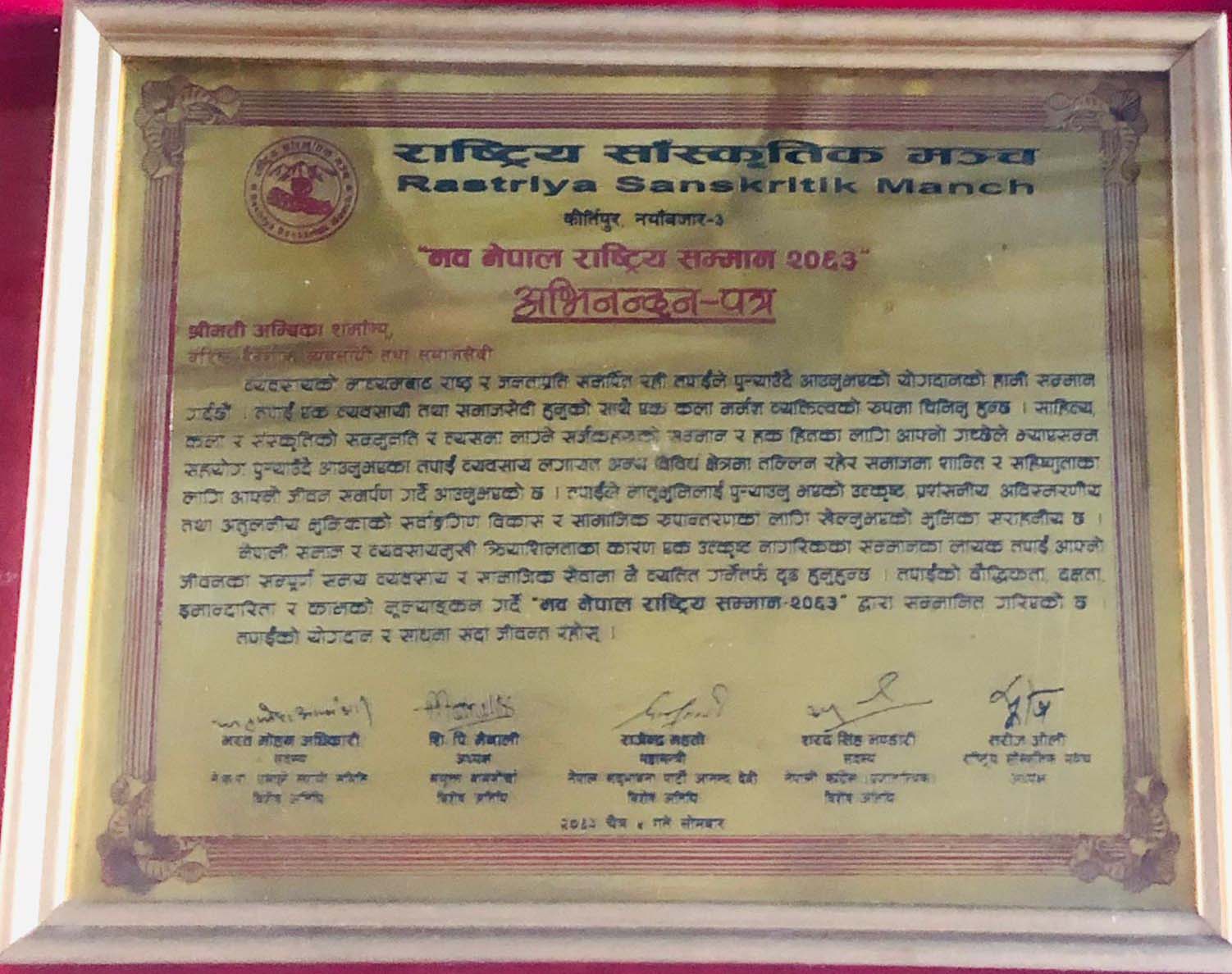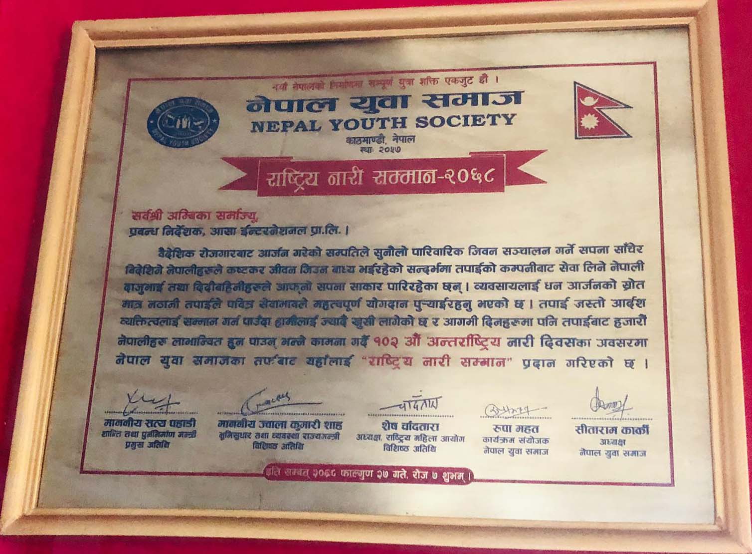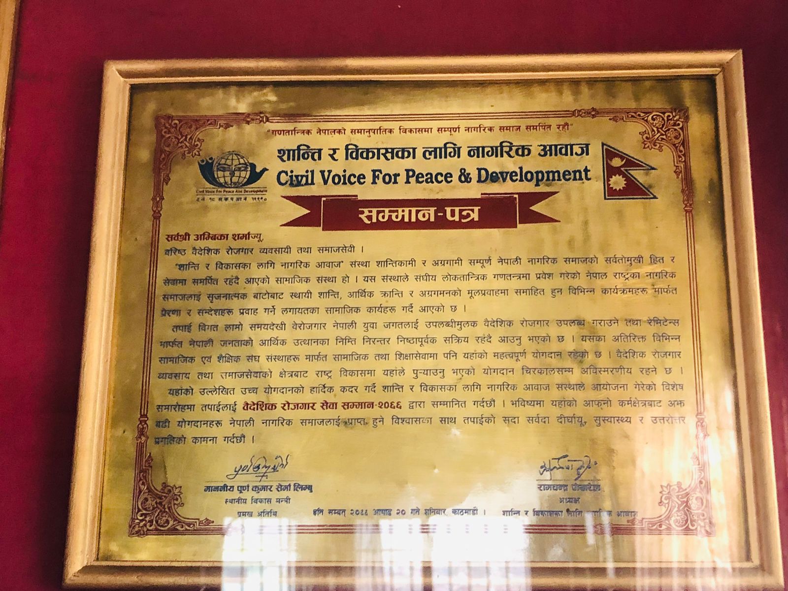 Civil Voice for peace Social Works Nepal Youth Society Rastriya Sanskritik Manch Japan Training NDFEE Forum NAFEA Appreciation3 NAFEA Appreciation NAFEA Appreciation2 Women Leadership Award